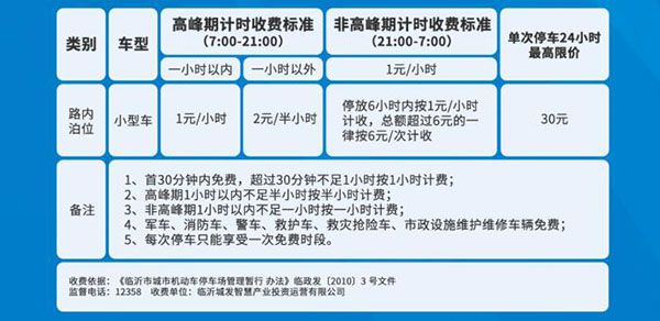 7月初,临沂智慧停车平台——“乐泊临沂”正式开启收费试运营,试运营期间在规定的泊车时间内,全天单次泊车最高收费1分钱,试运营结束后将执行《临沂市城市机动车停放服务收费管理试行办法》(临政办发[2010]125号)。具体收费标准如下: