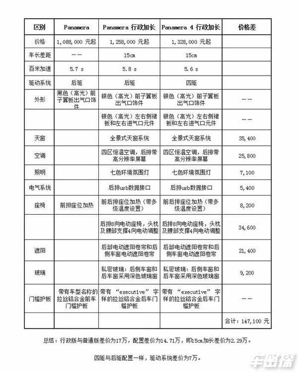 有网友总结了行政加长版本和普通版本的区别,虽然差价为17W,但是配置差价为14.71W,虽然慢了0.1秒但是长了15cm,这一部分的价格2W多一点,而行政加长4S的差价为7W,相对而言不少车友都觉得买加长版本的更实用一些。而行政多出来的配置其实对于密探来说还算是实用,作为老款帕拉梅拉的车主来说,四驱恒温空调确实比较有用,天窗和氛围灯也是必选的一个配置。后部的电动遮阳帘其实倒是用的时候不多,但是夏天阳光强烈的时候,有遮阳帘确实要好很多。